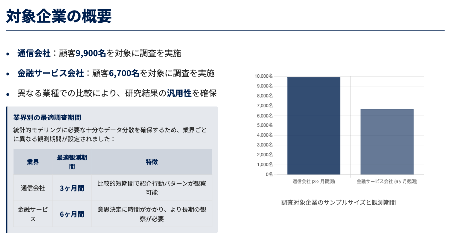 異なる業種で同様の分析を行うことで、結果の再現性と汎用性を確保しました。