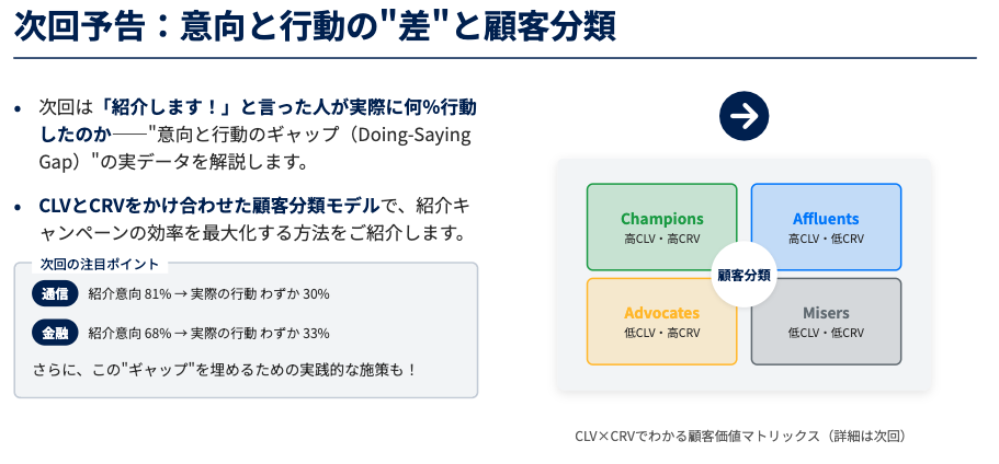 次回は、この実験から明らかになったDoing-Saying Gapと、CLVとCRVを用いた顧客分類の詳細をお伝えします。