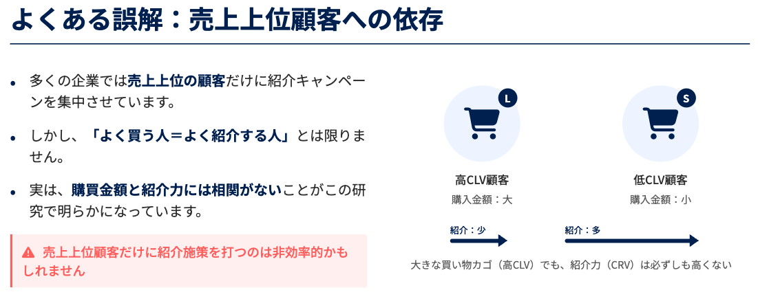 よく買ってくれる顧客が必ずしも多くの紹介をしてくれるわけではない、という事実が、戦略の前提を変えます。