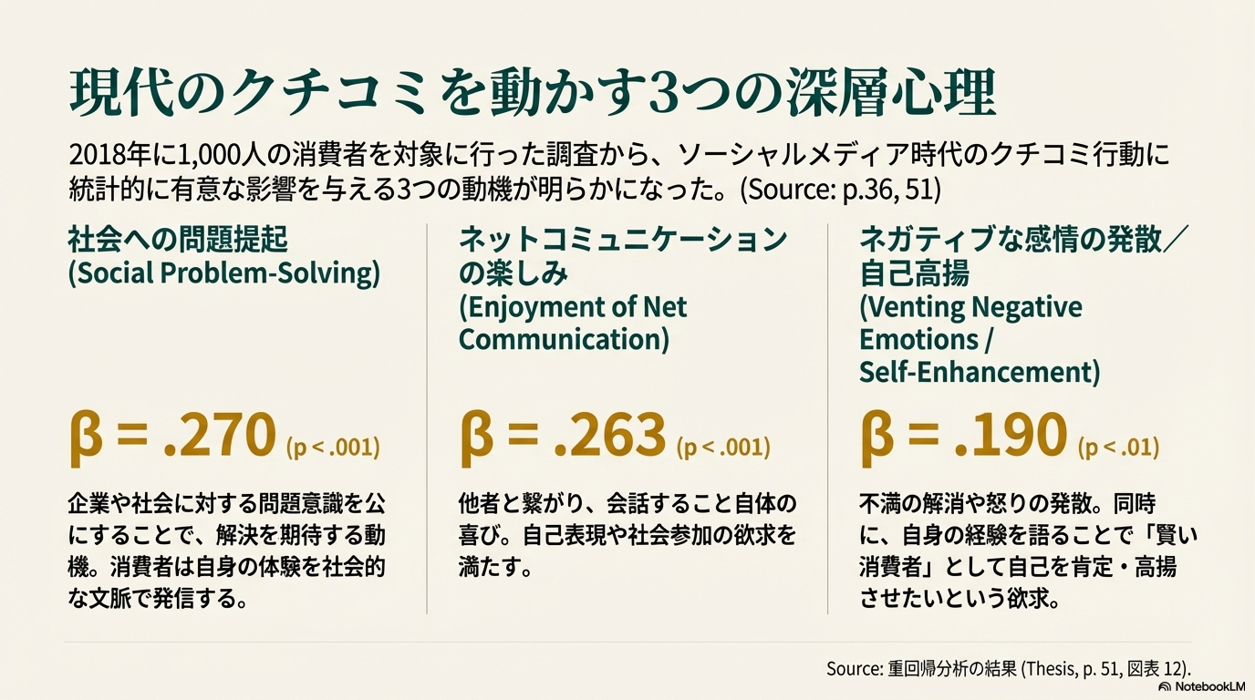 3.ネガティブな感情の発散/自己高揚 (β=.190, p<.01) – 不満の解消や、自分を価値ある消費者として肯定したい欲求