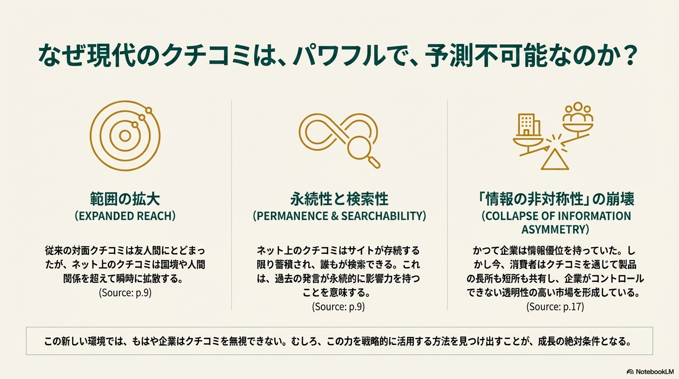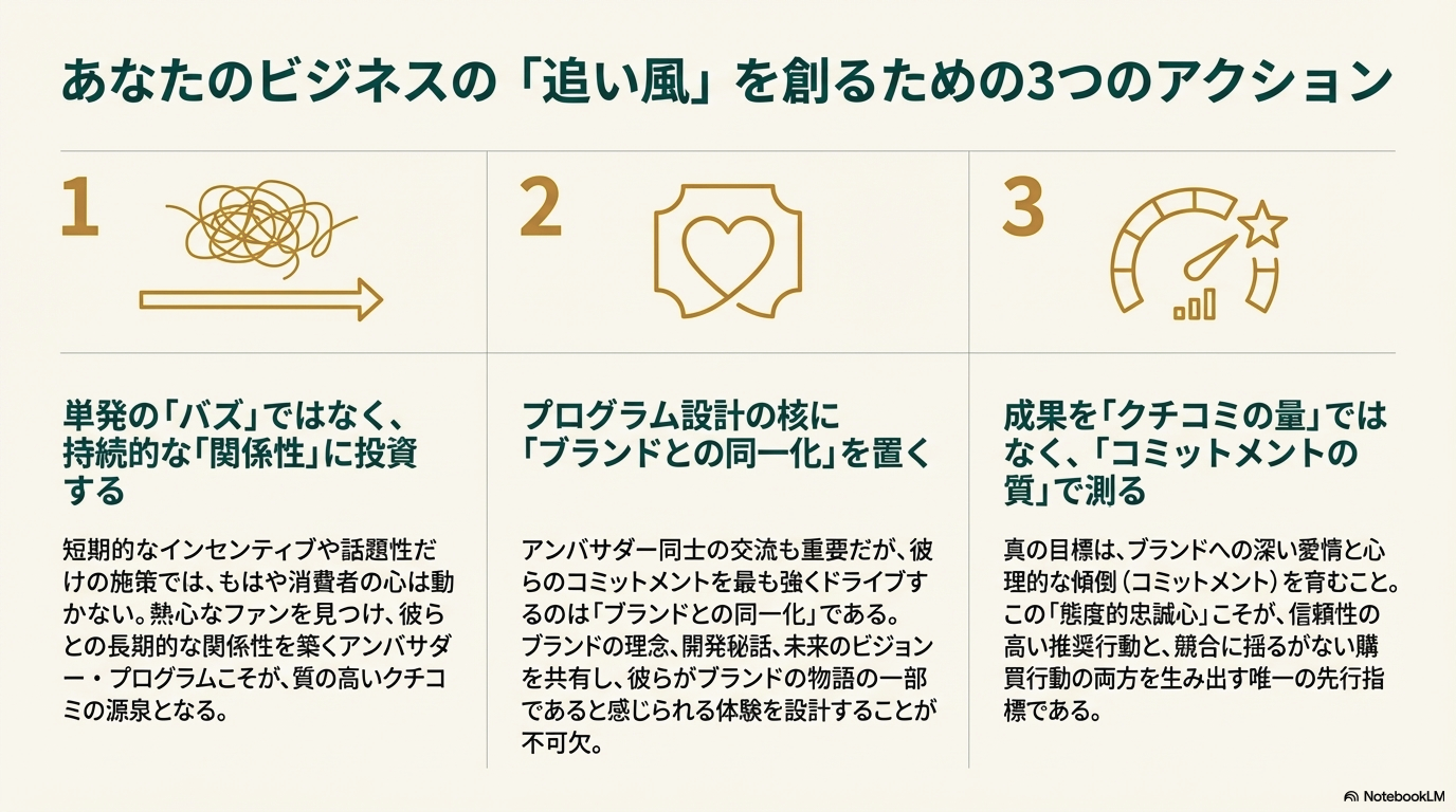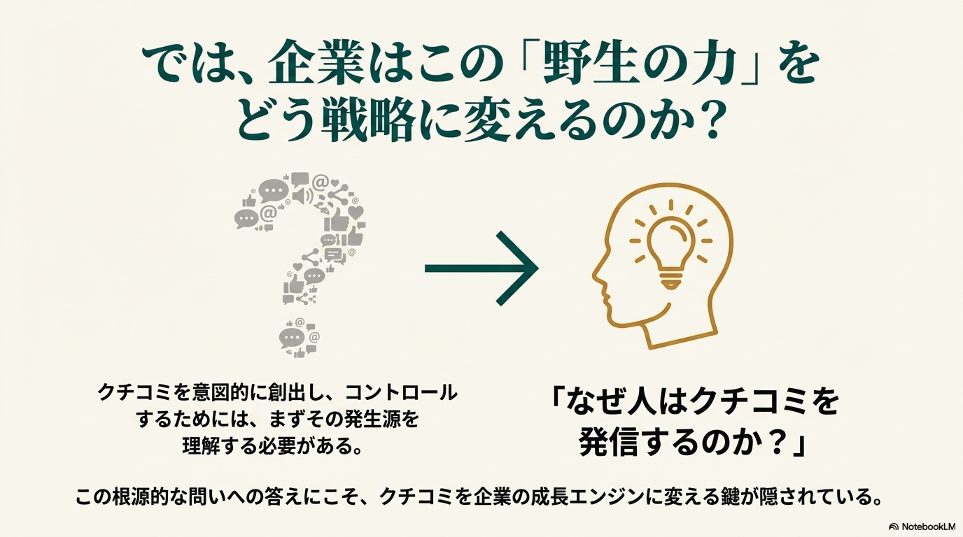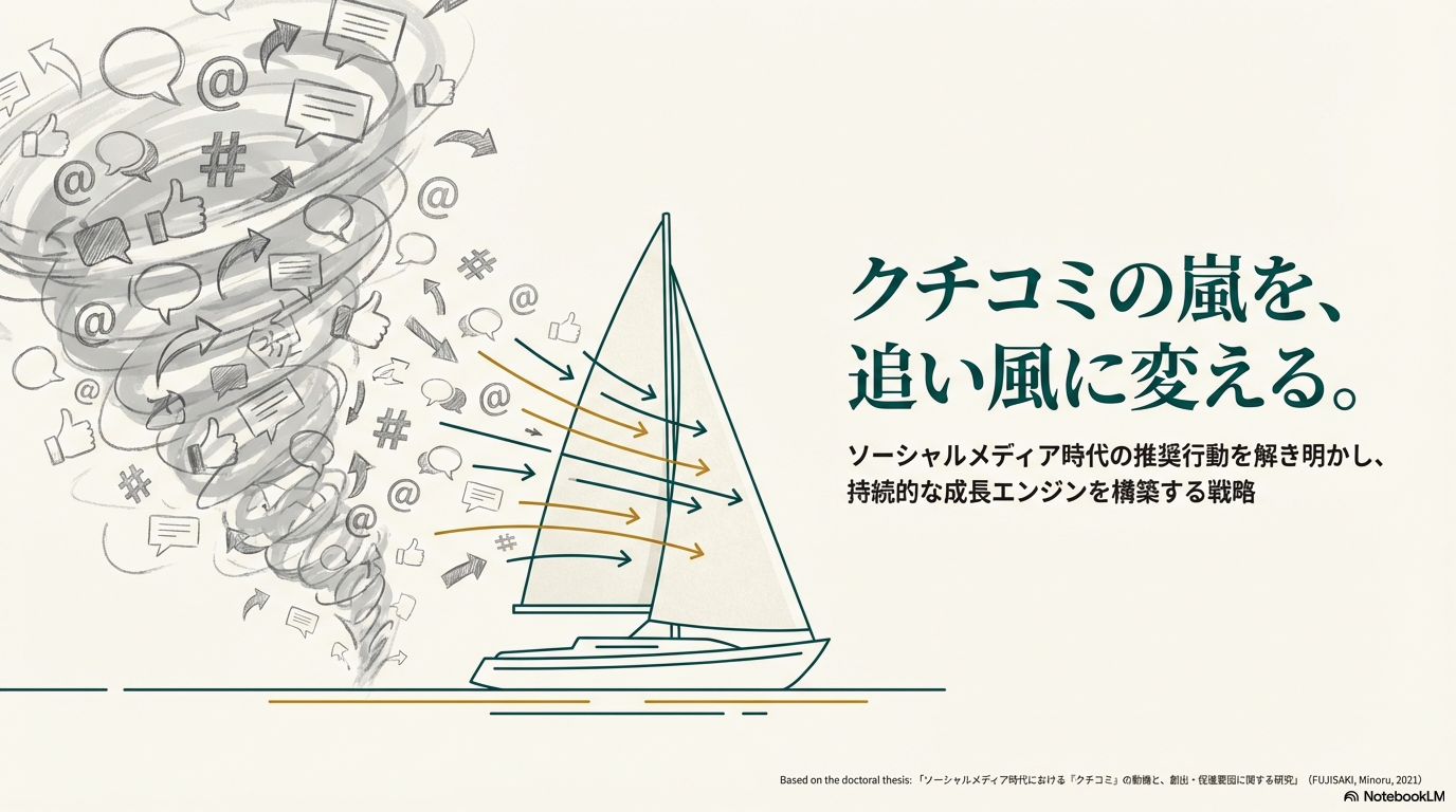 藤崎氏の研究の最大の価値は、コントロール不可能に見える「クチコミの嵐」を、戦略的に活用できる「追い風」に変えるフレームワークを提示している点です。