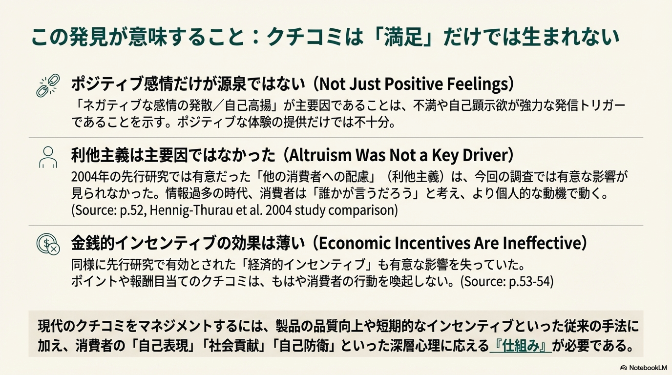 重要な発見として、従来重視されてきた「利他主義」(他の消費者への配慮)や「金銭的インセンティブ」の影響力は、統計的に有意ではありませんでした。つまり、「ポイントを付与すればクチコミが増える」という単純な施策は、もはや機能しないのです。
