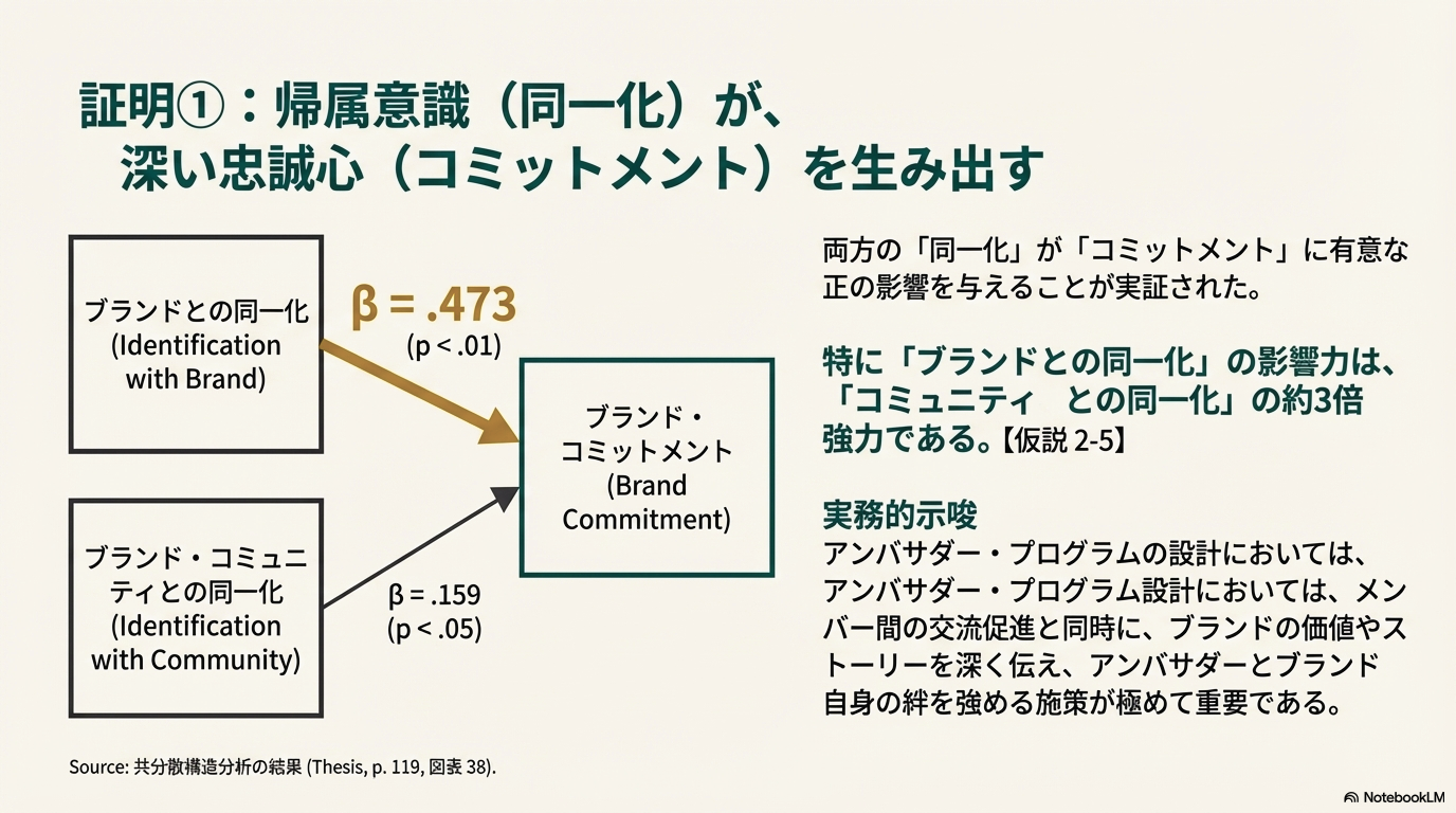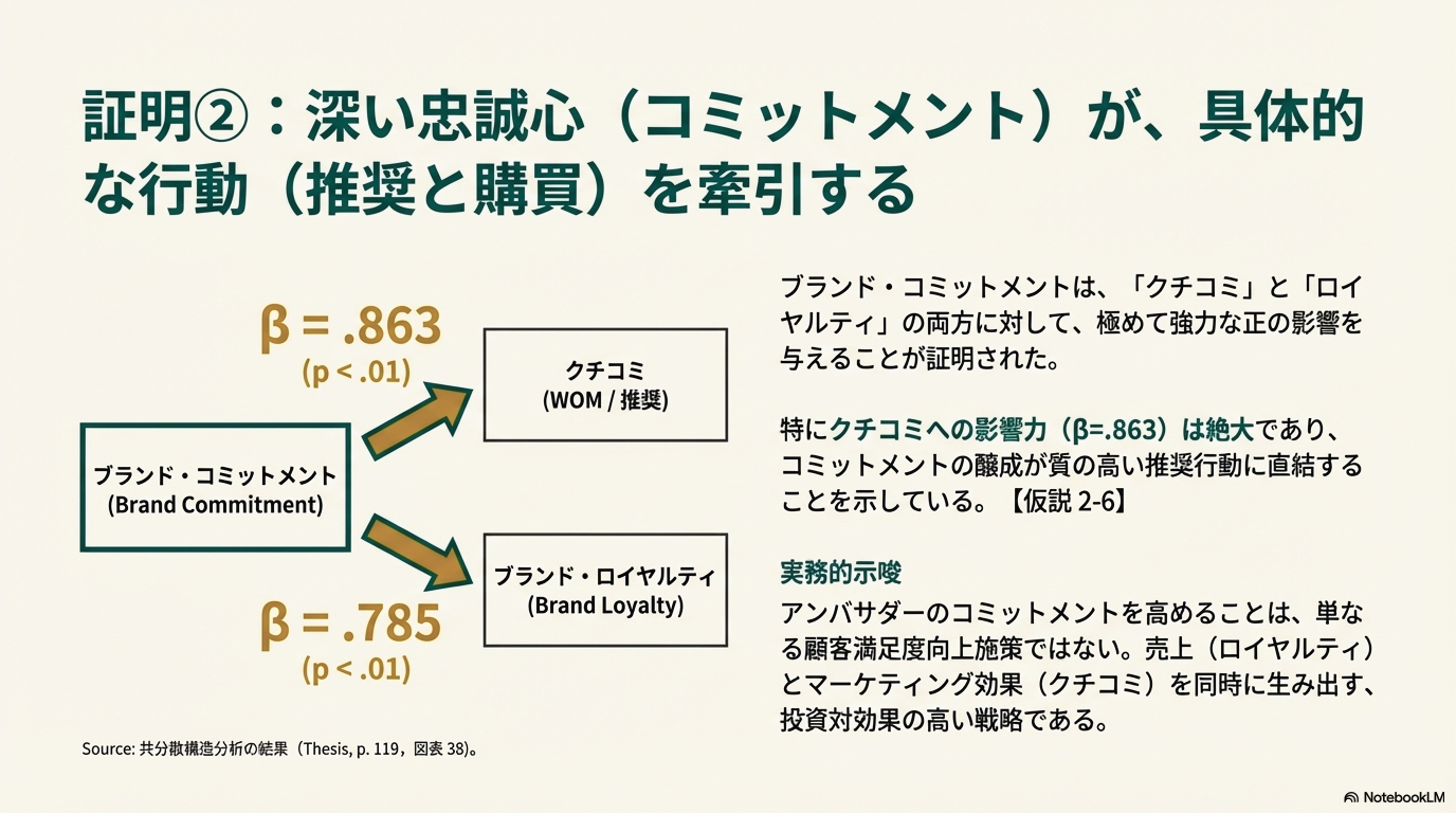 ブランドに対する深い心理的傾倒(コミットメント)を醸成できれば、質の高い推奨行動に直結することが証明されました。この効果量(β=.863)は、マーケティング研究において極めて強力な値です。