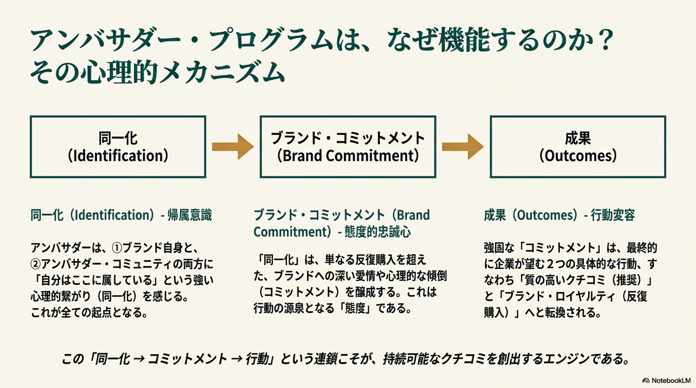 ブランド・コミュニティにおける同一化がメンバーのロイヤルティやクチコミに影響することは、先行研究でも指摘されていました。藤崎氏の貢献は、これを実務的なアンバサダー・プログラムの文脈で実証した点にあります。