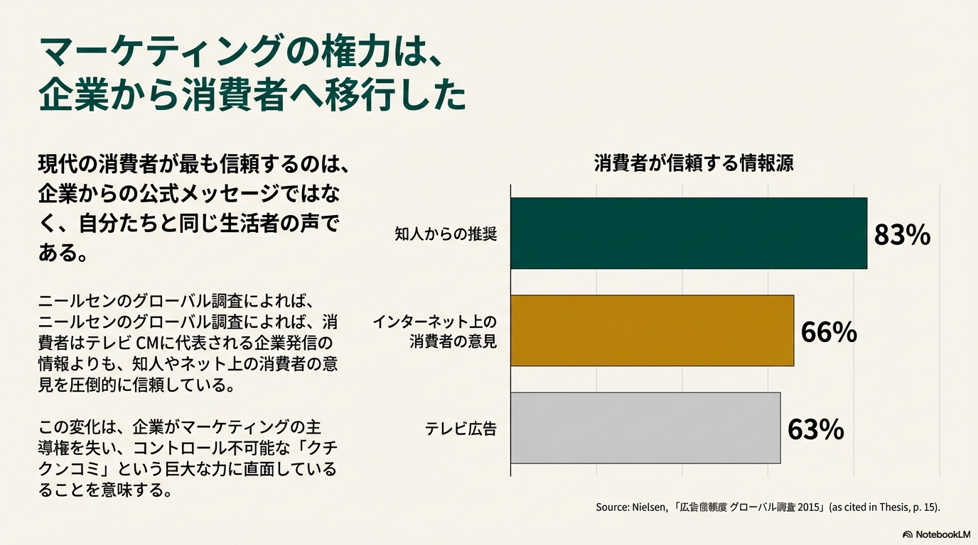 現代のマーケティング環境は激変しています。Nielsen の調査によれば、消費者が最も信頼する情報源は「知人からの推奨」(83%)であり、「インターネット上の消費者の意見」(66%)、「テレビ広告」(63%)を大きく上回っています。