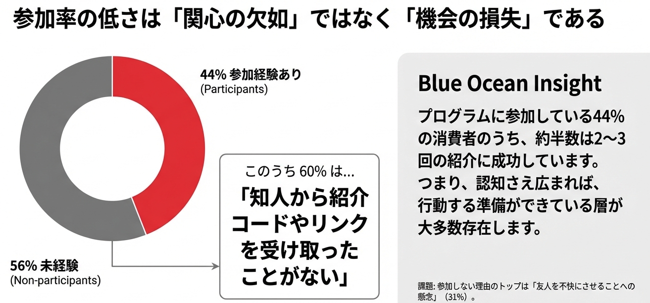調査によると、消費者の56%は紹介プログラムへの参加経験がありません。この高い壁の正体を理解することが、設計の第一歩です。