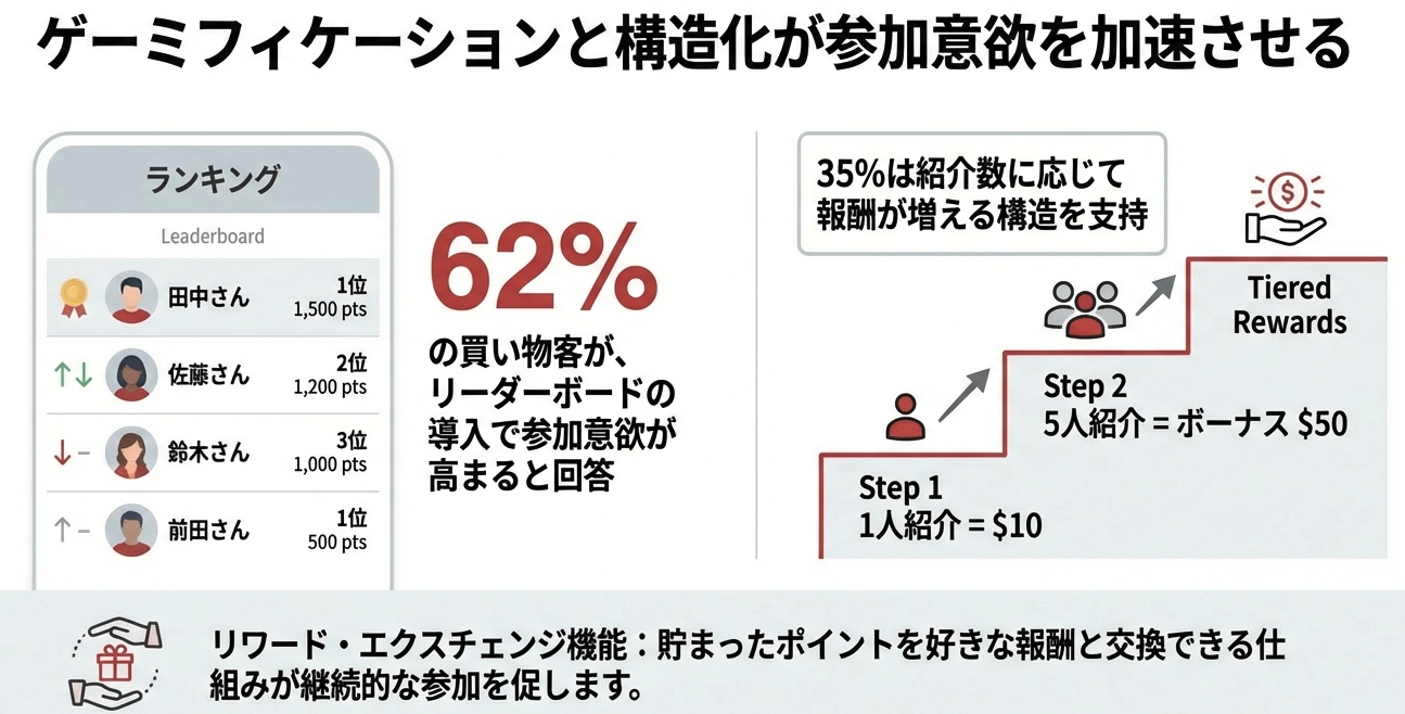 A:驚くべきことに、消費者の62%が「リーダーボードがあれば参加意欲が高まる」と回答しています。承認欲求や競争心、コミュニティへの貢献感を刺激する設計は非常に強力です。