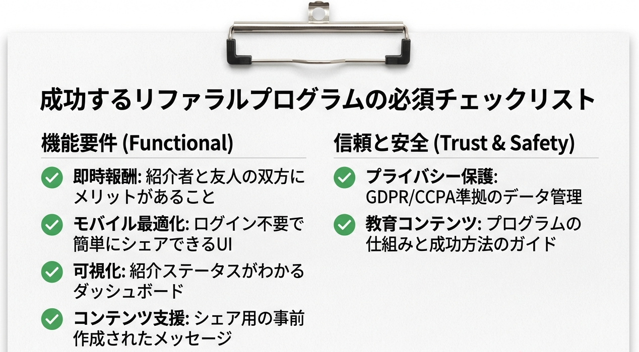 紹介プログラムの成功は、単に高い報酬を用意することではなく、紹介者が感じる「心理的摩擦」を丁寧に取り除き、紹介行為そのものを「スムーズで心地よい体験」に変えられるかどうかにかかっています。「100の法則」に基づく表示の最適化と、モバイルファーストなUX、そしてデータ安全性の担保。これらが揃って初めて、既存顧客はブランドの真の「アドボケイト(提唱者)」となります。