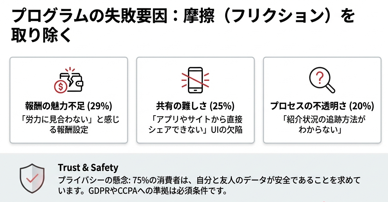紹介を躊躇する要因の一つに、個人情報の取り扱いへの懸念があります。消費者の75%は、自分と友人のデータが安全に保護されている保証を求めています。GDPRやCCPAなどのプライバシー法規制に準拠したプラットフォームを採用し、その旨を明示することは、参加率を左右する重要な信頼要素となります。