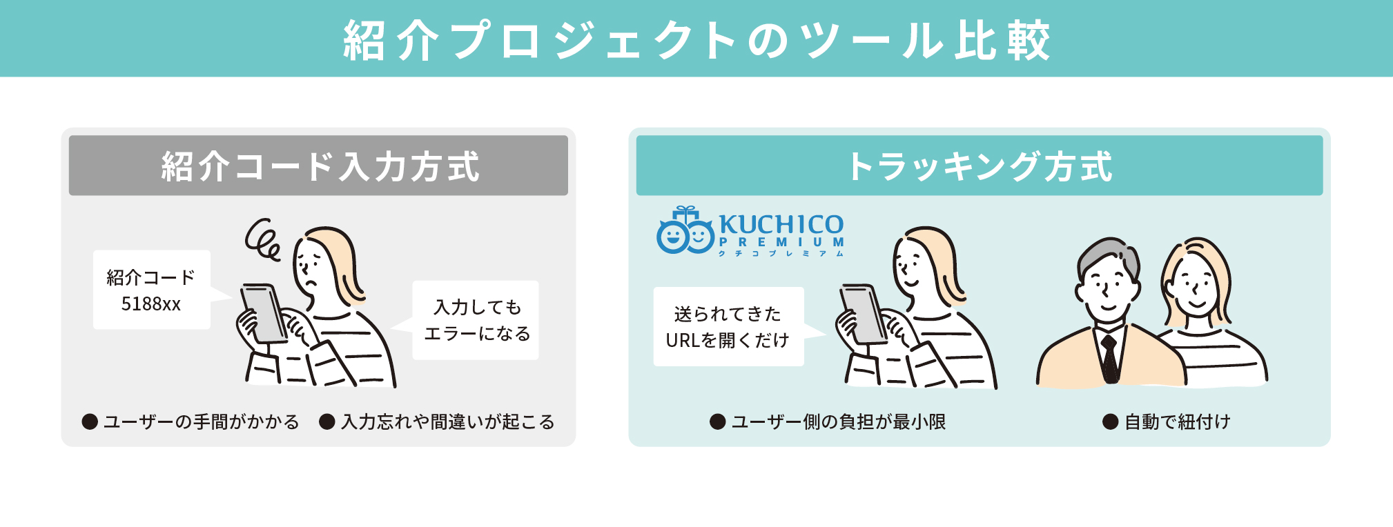 なお今回、クチコプレミアムの導入を決定した背景には、紹介者と被紹介者を正確に紐づけ、その関係をトラッキングできる仕組みに注目したことがあります。プロジェクトの設計において、この「紹介の紐づけ」が確実に担保されていることは、運用の信頼性と効率性を高めるうえで極めて重要でした。