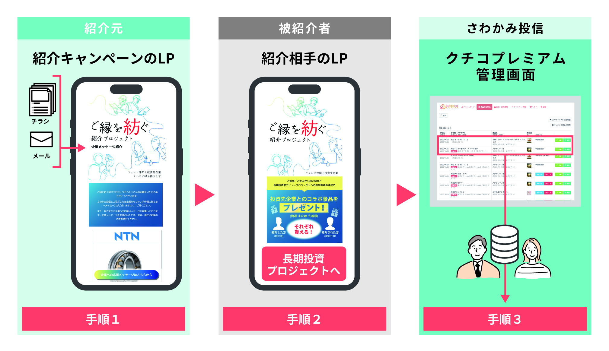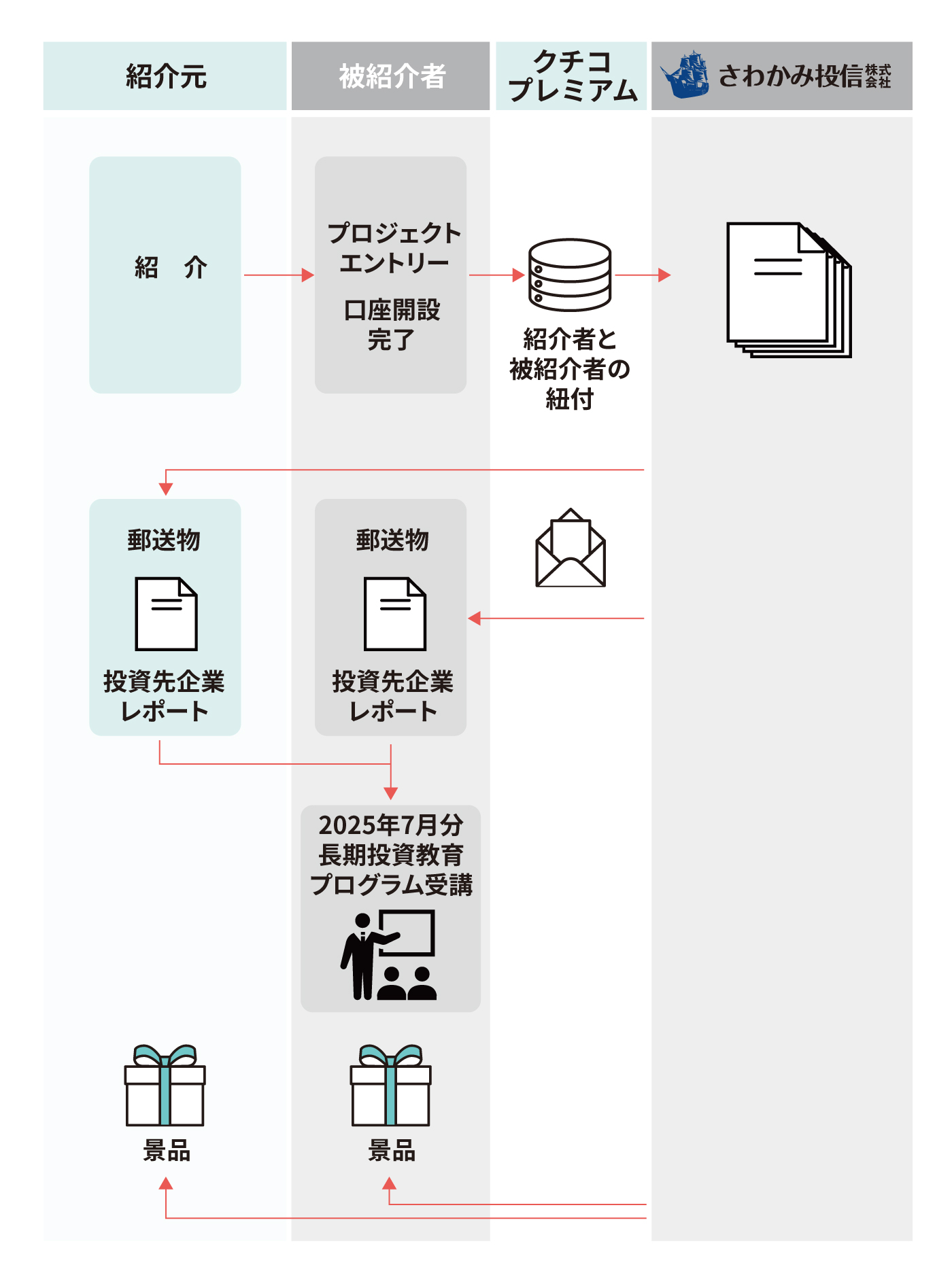 そのリンクを友人・知人に共有いただき、リンク経由で新規顧客が口座を開設し、同時開催の投資の学びと実践の機会を提供するプロジェクト「長期投資家デビュープロジェクト」に参加された場合、紹介が成立したものとして取り扱い、双方に景品を提供する形式を採用しました。