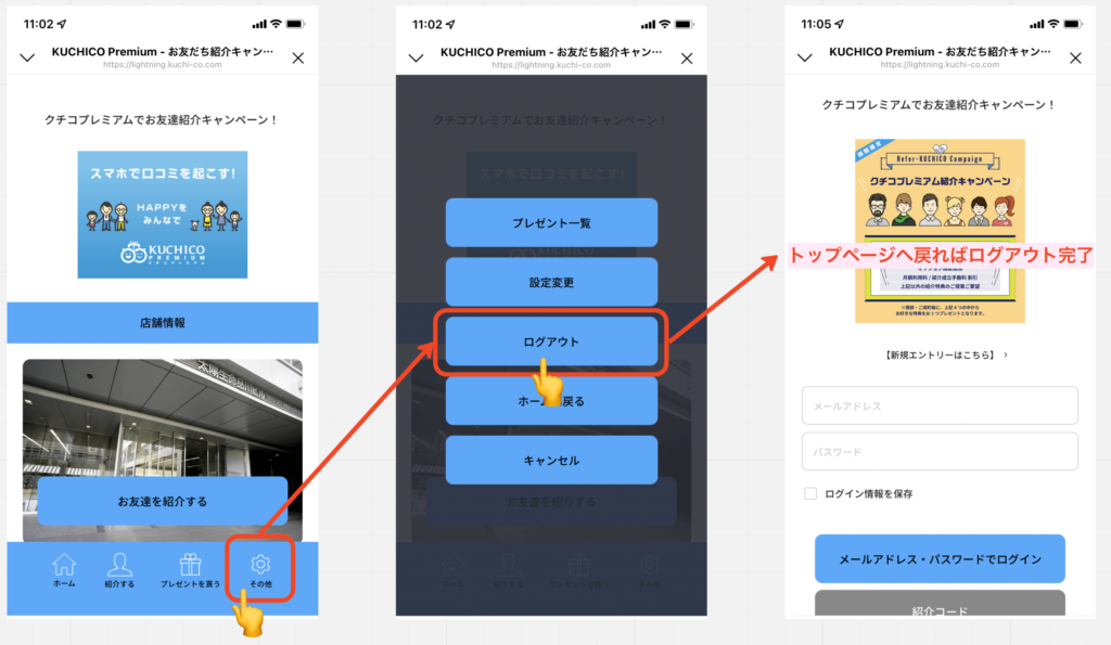 退会方法 KUCHICO PREMIUM 退会方法 はコメントを受け付けていません 2手順でクチコプレミアムを退会することができます。 1.ユーザー様がクチコからログアウト2.管理者様が会員情報を削除これでクチコプレミアムを退会することが可能となっております。 1.ユーザー様がクチコからログアウト その他 → ログアウト → トップページ※トップページに遷移すればログアウト完了となります。 2.管理者様が会員情報を削除 【施設・会員情報】「会員情報」 → 削除したい会員の「✖️」を選択確認画面(POP)の「OK」を選択 → 削除できていれば退会完了