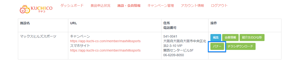 キャンペーンPRバナーの使い方 KUCHICO PREMIUM キャンペーンPRバナーの使い方 はコメントを受け付けていません キャンペーンページへのリンクを貼り付けられるよう、バナーをご用意しています。 [施設・会員情報]からバナーをクリック。 PRバナーのそれぞれの右側に貼り付け用コードが表示されますので、Webサイトやバナーに貼り付けてご利用ください。