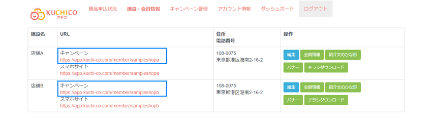 キャンペーンURLの確認 KUCHICO PREMIUM キャンペーンURLの確認 はコメントを受け付けていません メニューの[施設・会員情報]を選択→施設のそれぞれのキャンペーンURLが表示されます。