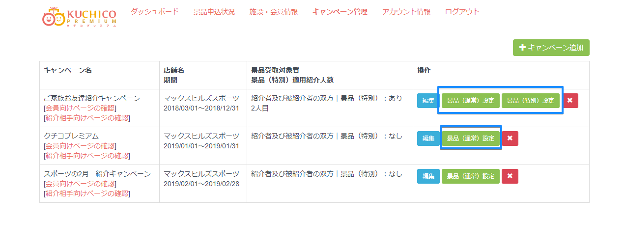 商品の設定について KUCHICO PREMIUM 商品の設定について はコメントを受け付けていません キャンペーン作成後に表示されるキャンペーン一覧より商品の設定をします。 景品(通常)設定 お友だちを一人紹介する度に、または新規入会した際に選べるプレゼントです。 景品(特別)設定 お友だちを紹介する度に、もらえる商品を変えることができます。 例えば、通常のプレゼントはスイーツのみに設定、 特別景品はお肉のみに設定すると、設定された人数の紹介時は お肉のキャンペーンのみが表示されます。 設定人数はキャンペーン作成時、またはキャンペーンの編集から設定できます。
