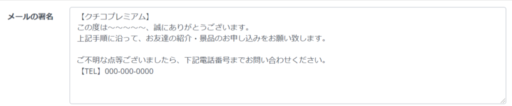 クチコプレミアムでは、新規会員登録時に登録完了の通知をメールにてお送りしており、上記メールの署名を設定することが可能となっております。