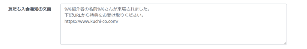 管理画面「施設・会員情報」 → 操作の欄の「編集」 → 「 友だち入会通知の文面 」へ記載後 → 保存を押して完了