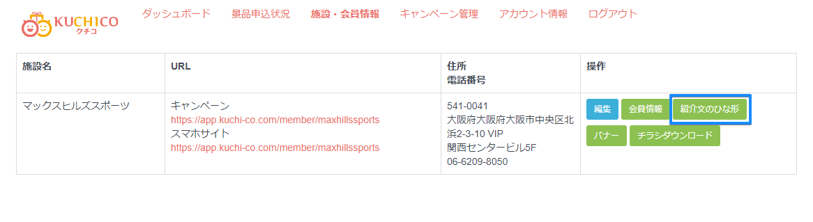 メニューの[施設・会員情報]をクリックし、操作から[紹介文のひな形]をクリックします。