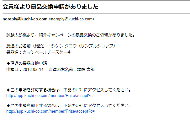 メールでの承認 KUCHICO PREMIUM メールでの承認 はコメントを受け付けていません アカウント設定でメール通知が「あり」になっている場合、 景品申請のメールでの承認・却下の操作が可能です。 届いたメールにURLが記載されていますので、該当のURLをクリックしてください。