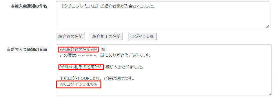 「紹介者の名前」「紹介相手の名前」「ログインURL」を併せて設定致しますと、自動で上記3つを生成されるように設定することも可能となっております。