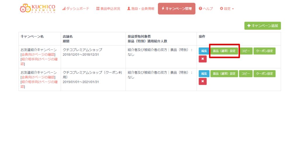 景品を設定するキャンペーンの景品設定ボタンをクリックします。